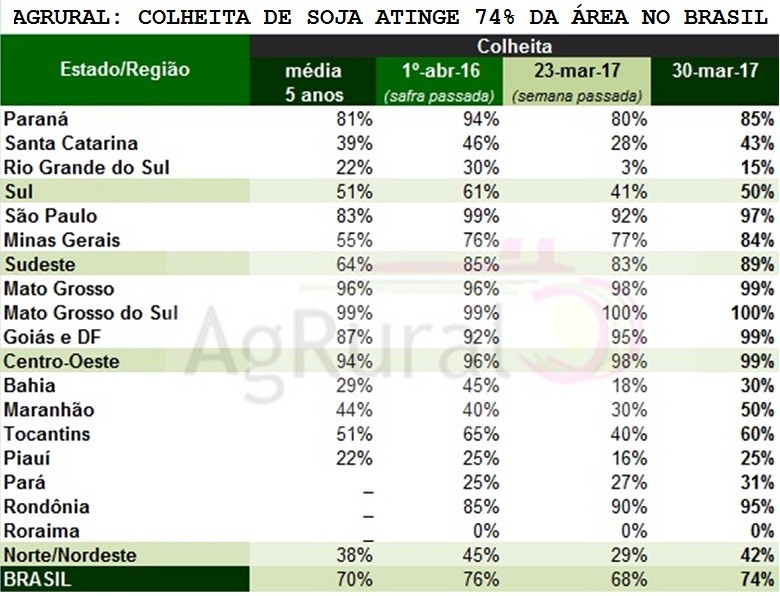 Os produtores brasileiros colheram até ontem 74% da área de soja, segundo estimativa da consultoria AgRural. Pela primeira vez nesta safra os trabalhos estão abaixo do ritmo do ano passado, quando nesta época 76% da área estava colhida. Entretanto, o desempenho está acima dos 70% da média de cinco anos.