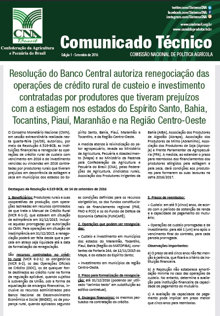 Brasília (16/09/2016) - O Conselho Monetário Nacional autorizou, nesta quarta-feira (14/09), em reunião extraordinária, por meio da Resolução 4.519 do Banco Central, a renegociação das operações de crédito rural de custeio e investimentos contratadas por produtores rurais que enfrentaram dificuldades e prejuízos, em consequência da estiagem e seca nos estados do Espírito Santo, Bahia, Tocantins, Piauí, Maranhão e na região Centro-Oeste.