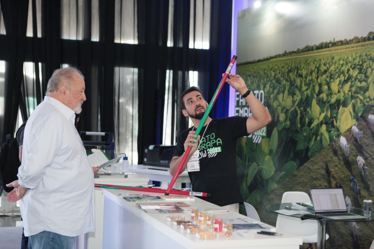 Morte do braquiarão – A Síndrome da Morte da Braquiária (SMB) foi tema de um pôster no Famato Embrapa Show. De acordo com estudos da Embrapa, a morte do capim-mandaru (braquiarão) pode ser causada pela baixa tolerância da espécie ao excesso de umidade do solo, causando deficiência de oxigênio e, consequentemente, alterações morfofisiológicas no sistema radicular.