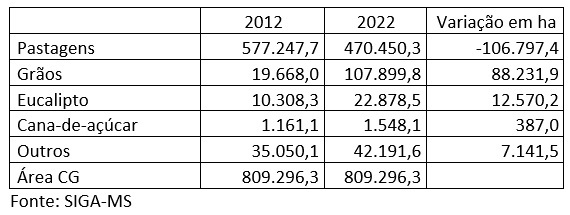 A expansão da produção agropecuária se deu com base na conversão de áreas. A produção agrícola cresceu em áreas anteriormente ocupadas por pastagens. Nos últimos 10 anos, a conversão foi superior a 106 mil hectares, sendo 83% delas para produção de grãos e outros 12% destinados a florestas plantadas, especificamente eucalipto.
