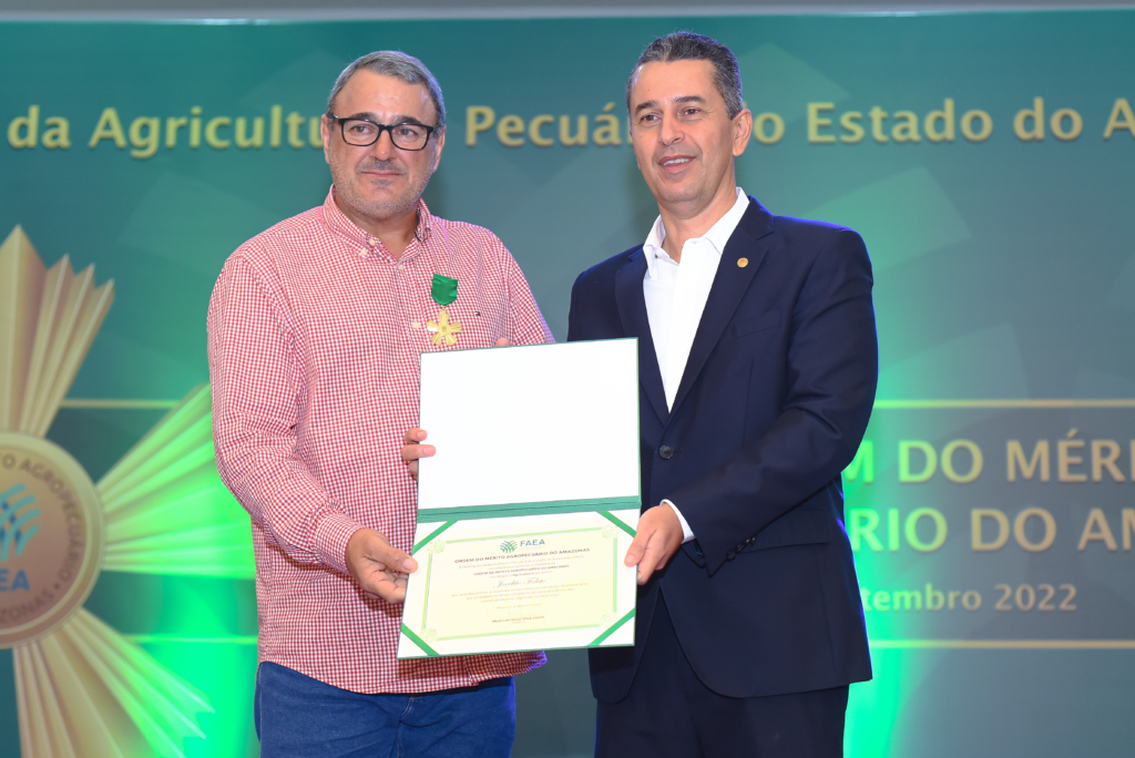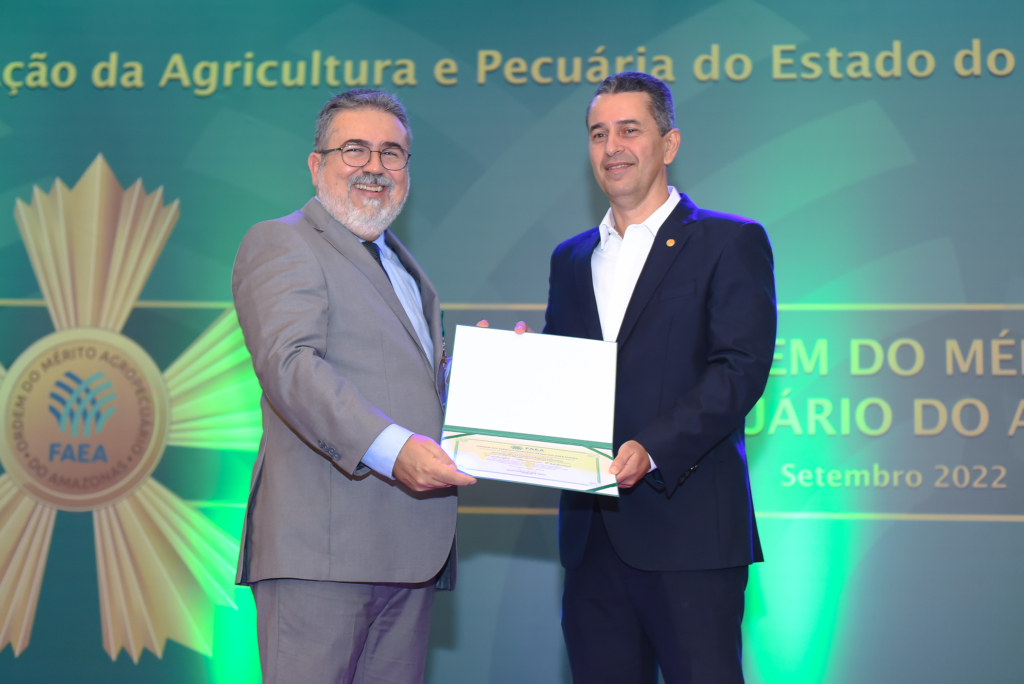 A maior honraria da noite, a medalha do Mérito Agropecuário Eurípedes Lins, dedicada a instituições que prestam relevantes serviços ao setor rural, foi concedida à Embrapa Amazônia Ocidental, instituição que tem grandes serviços prestados ao desenvolvimento do agro amazonense. O chefe-geral da instituição, Everton Rabelo Cordeiro.