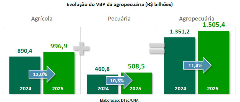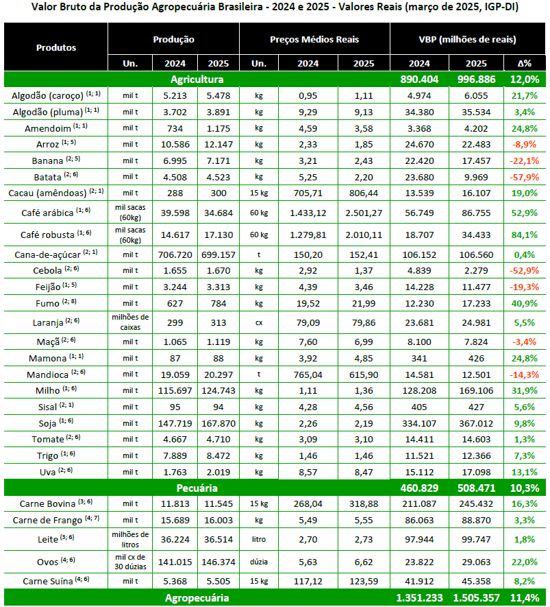 O Valor Bruto da Produção (VBP) da agropecuária deve atingir R$ 1,51 trilhão em 2025, o que representa crescimento de 11,4% em relação ao valor registrado em 2024. O VBP corresponde ao faturamento bruto dentro dos estabelecimentos rurais, considerando as produções agrícolas e pecuárias, com base na média dos preços reais (IGP-DI) recebidos pelos produtores de todo o país.