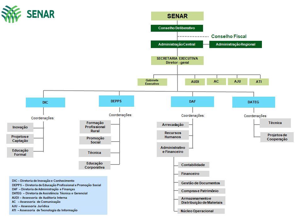 A Administração Central assegura suporte administrativo, metodológico e jurídico, além de ser responsável pela interface com os órgãos federais, instituições nacionais e internacionais ligadas à educação e ao trabalho, irradiando experiências exitosas para as Administrações Regionais, que oferecem ao público do Senar em todo o país ações de Formação Profissional Rural (FPR) e atividades de Promoção Social (PS), a partir das quais são desenvolvidas competências profissionais, contribuindo para o avanço socioeconômico dos cidadãos do campo.