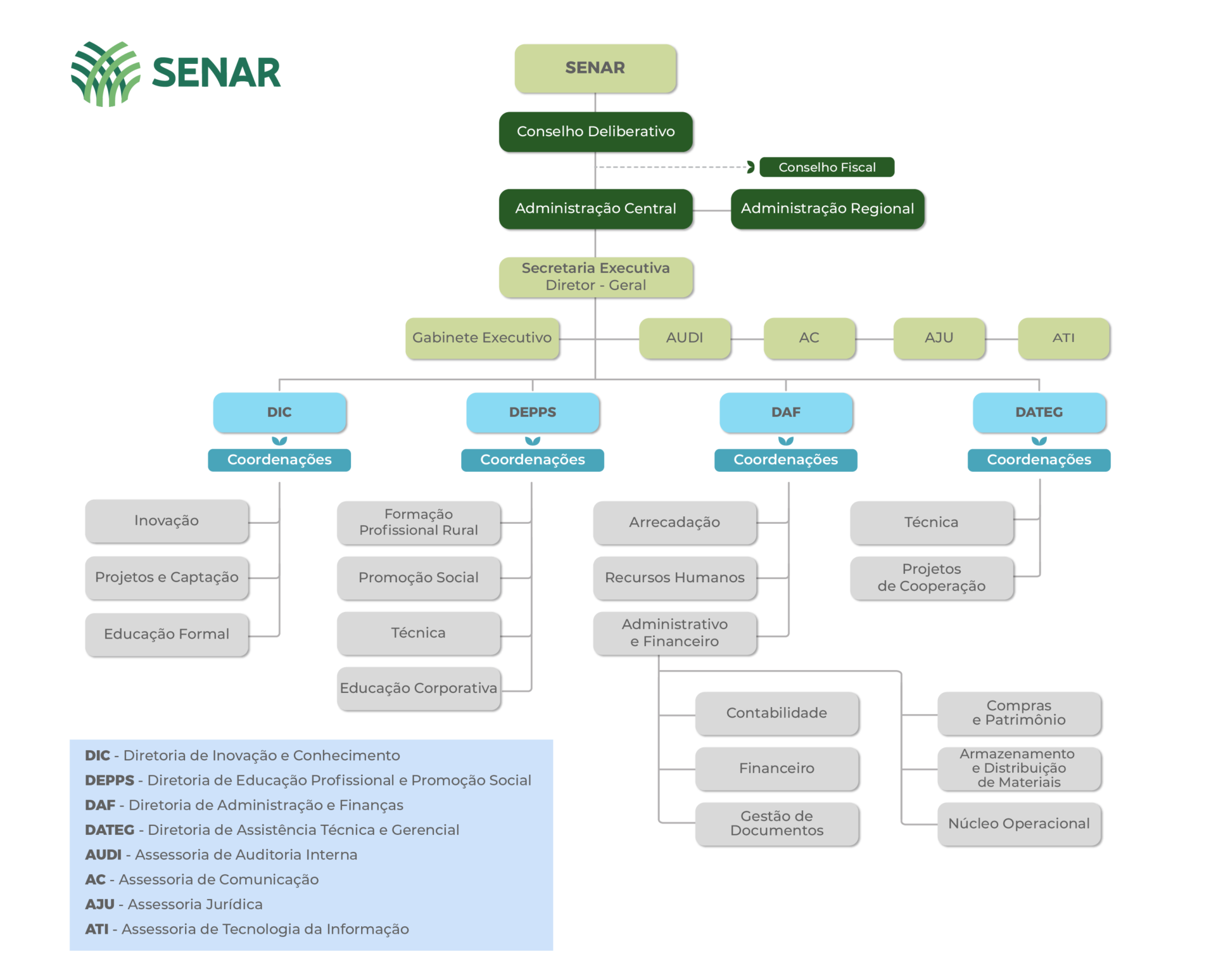 A Administração Central assegura suporte administrativo, metodológico e jurídico, além de ser responsável pela interface com os órgãos federais, instituições nacionais e internacionais ligadas à educação e ao trabalho, irradiando experiências exitosas para as Administrações Regionais, que oferecem ao público do Senar em todo o país ações de Formação Profissional Rural (FPR) e atividades de Promoção Social (PS), a partir das quais são desenvolvidas competências profissionais, contribuindo para o avanço socioeconômico dos cidadãos do campo.
