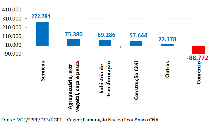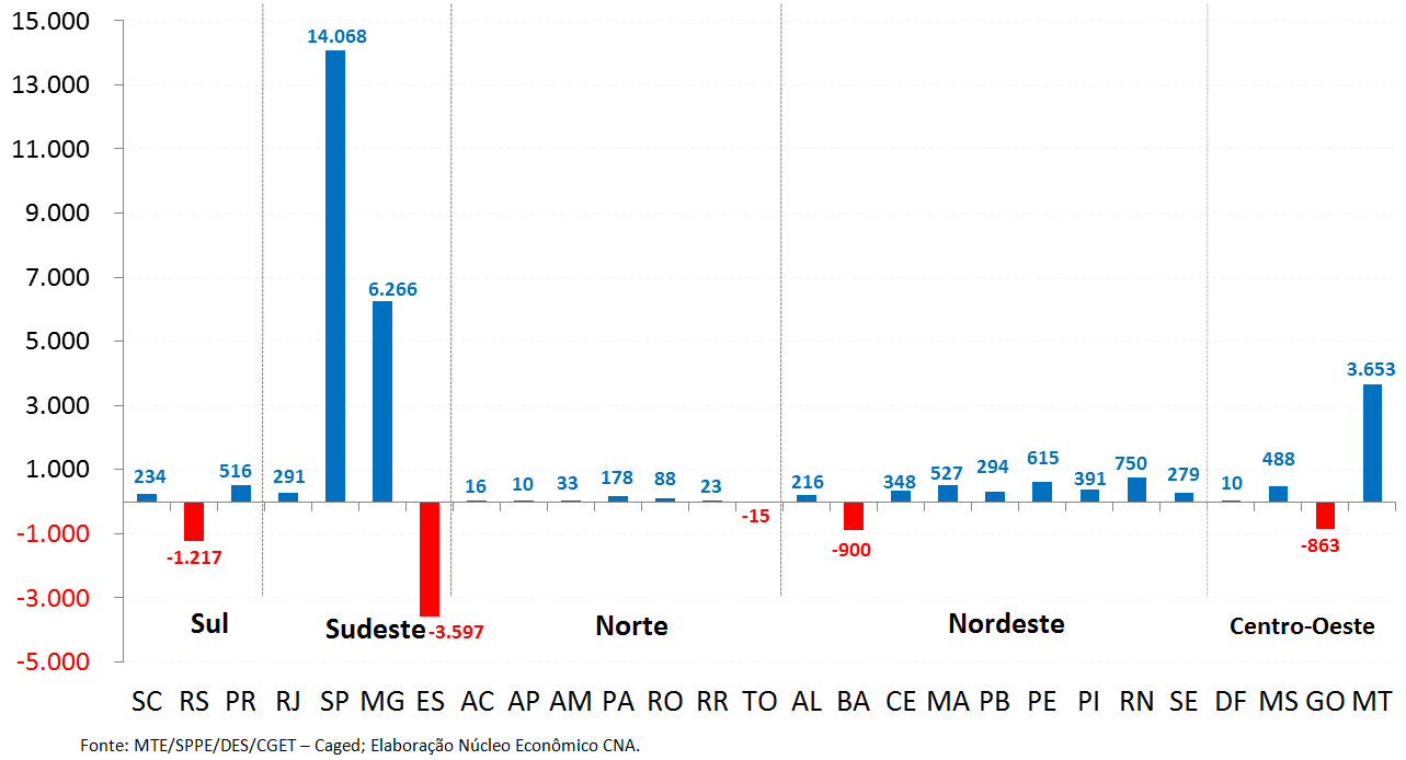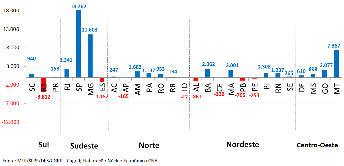 Atividades de Apoio à Agricultura (+8.276 postos) especialmente em São Paulo (+7.113 postos), Minas Gerais (+467 postos) e Espírito Santo (+415 postos);