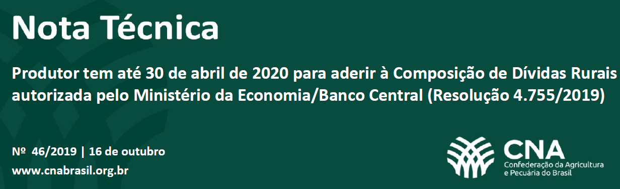 O Ministério da Economia publicou, em 16 de outubro de 2019, a Resolução 4.755/2019, que autoriza a composição de dívidas decorrentes de operações de crédito rural contratadas por produtores rurais ou por suas cooperativas de produção. A medida visa à concessão de crédito para a liquidação integral decorrente de uma ou mais operações contratadas até 28 de dezembro de 2017. Os interessados devem fazer a solicitação formal até 30 de abril de 2020.