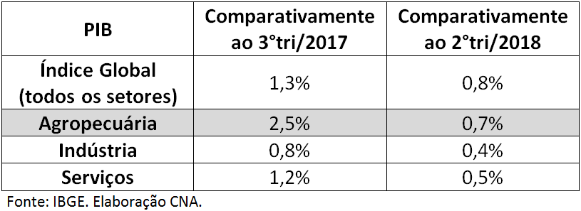 A agropecuária brasileira cresceu 2,5% no 3° trimestre de 2018, comparativamente ao mesmo período do ano anterior. Esse ritmo de crescimento da agropecuária foi praticamente o dobro que a expansão de 1,3% da economia brasileira no mesmo período. Os dados do Produto Interno Bruto (PIB) foram divulgados hoje, 30 de novembro de 2018, pelo Instituto Brasileiro de Geografia e Estatística (IBGE).
