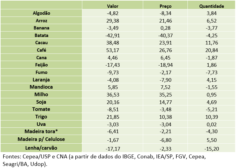Entre os produtos, os destaques em termos de altas de preços foram: milho, café, cacau e arroz, com altas superiores a 20%, além de soja, trigo, mandioca e cana. No caso da produção, esperam-se crescimentos importantes para café, cacau, trigo, arroz, madeira, soja, laranja e algodão, e alguma elevação moderada para milho e feijão.