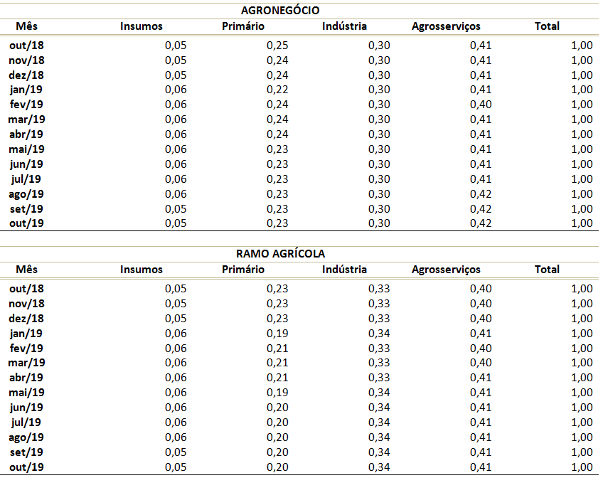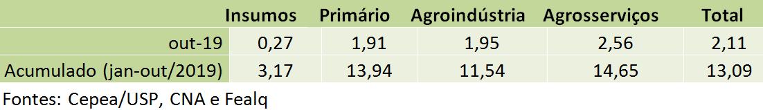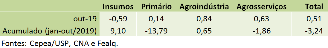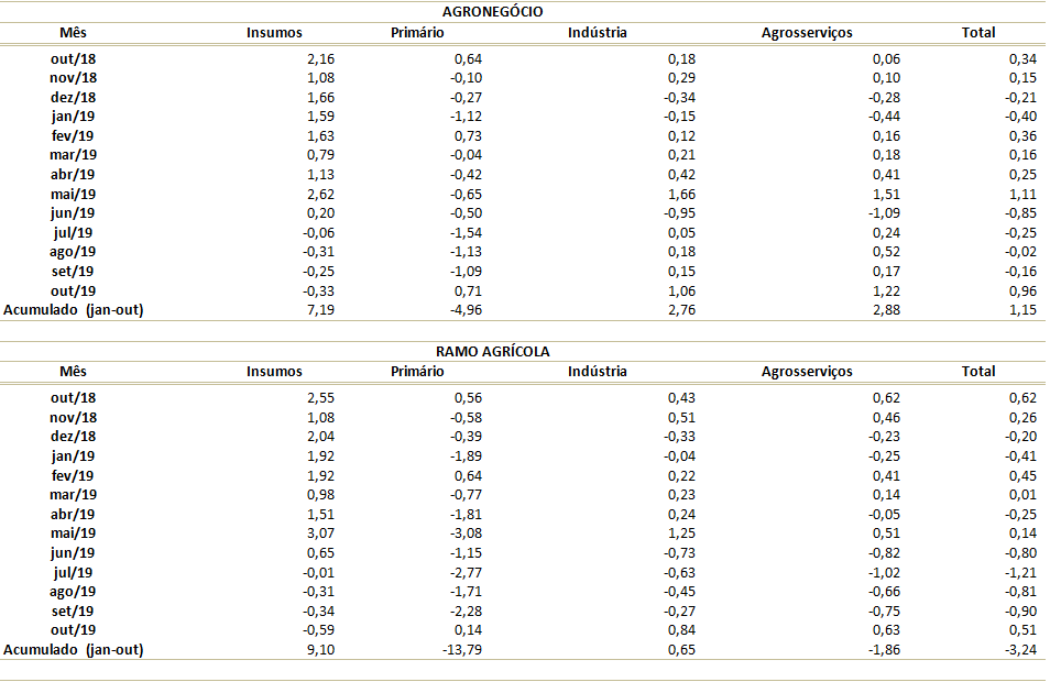 Com exceção do segmento de insumos – cuja retração foi de -0,33% - todos os demais segmentos do agronegócio apresentaram expansão em outubro de 2019: ‘dentro da porteira’, ou segmento primário (0,71%), agroindustrial (1,06%) e agrosserviços (1,22%). No acumulado de 2019 (janeiro a outubro), somente o segmento primário recuou (-4,96%), uma vez que houve expansão de 7,19% de insumos, 2,76% da agroindústria e de 2,88% dos agrosserviços (2,88%), conforme Tabela 1.