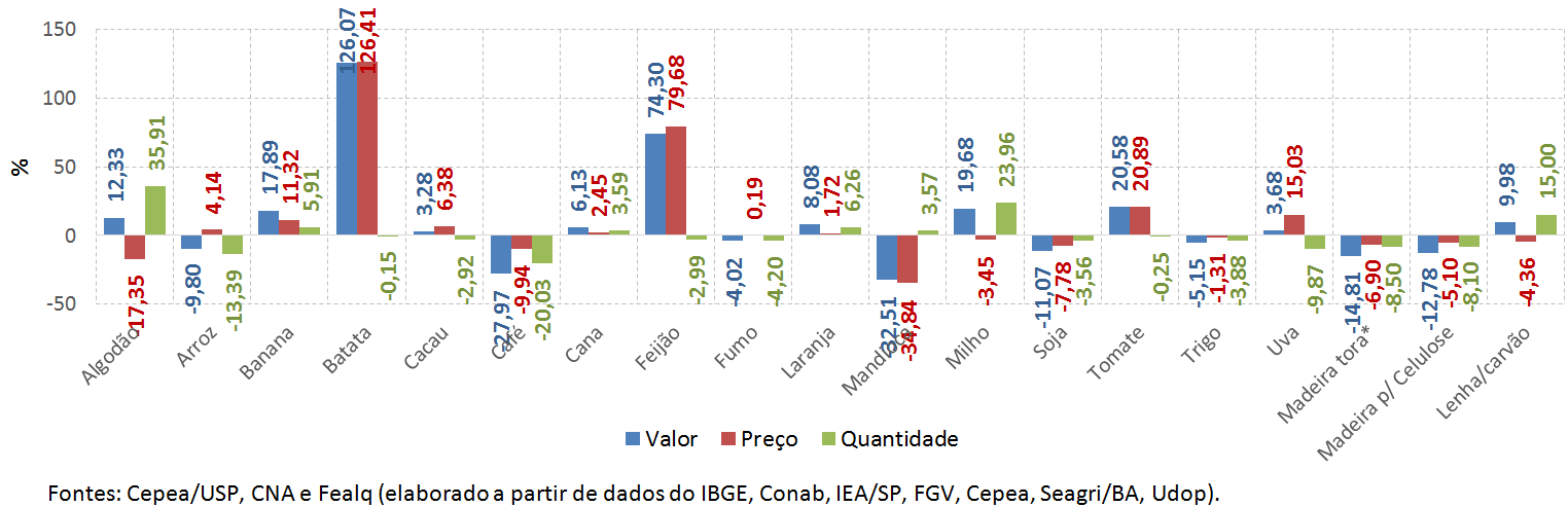 Para a cultura do feijão, o aumento no faturamento esperado de 74,30% para o ano é reflexo do aumento nos preços reais de 79,68%, uma vez há projeção de queda na produção esperada de 2,99%. De acordo com a Conab, a menor produção é reflexo da menor área destinada à cultura (-7,5%), uma vez que houve um aumento na produtividade. Como destacado nos relatórios anteriores e segundo o Instituto Brasileiro de Feijão e Pulses (Ibrafe), este resultado se deve às condições climáticas adversas e ao baixo desempenho da cultura na safra passada, que levaram à redução da área plantada e da produtividade.