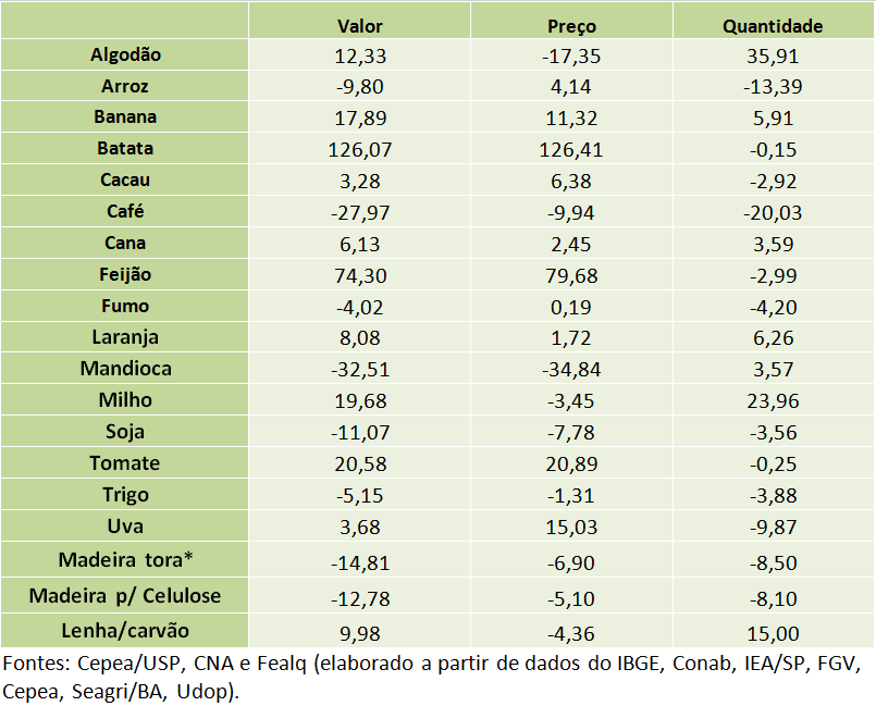 As Figuras 2 e 3 e a Tabela 4 detalham os resultados específicos do segmento por atividades agrícolas e pecuárias. Entre as culturas do segmento primário agrícola acompanhadas pelo Cepea, projetam-se crescimentos nos faturamentos em 2019 para algodão, banana, batata, cacau, cana-de-açúcar, feijão, laranja, milho, tomate, uva e lenha/carvão. Já as culturas para as quais se projetam quedas no faturamento são arroz, café, fumo, mandioca, soja, trigo, madeira em tora e madeira para celulose – Figura 2 e Tabela 4