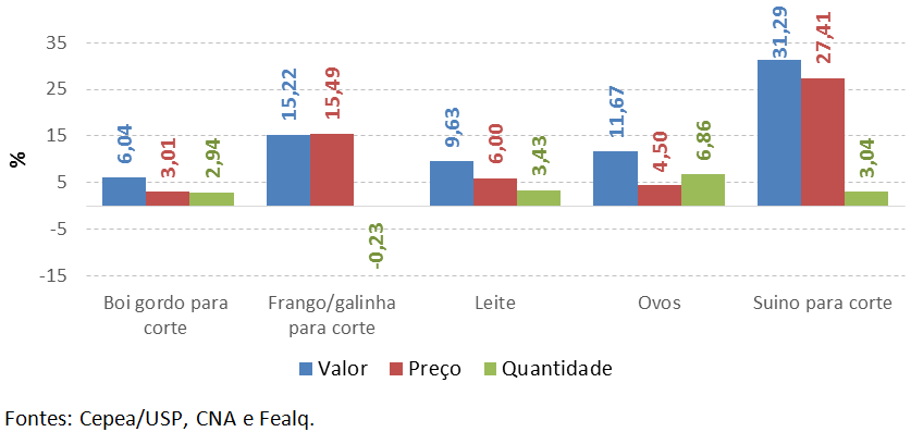 Seguindo a tendência dos meses anteriores, o ramo pecuário continuou crescendo significativamente, acumulando alta em todos os segmentos no período. A ocorrência da Peste Suína Africana nos países asiáticos, e o consequente incremento das importações chinesas de carnes suína, bovina e de aves, têm favorecido as cadeias pecuárias brasileiras. Além de impulsionar os preços, o bom desempenho das exportações tem estimulado também a produção, dentro e fora da porteira.