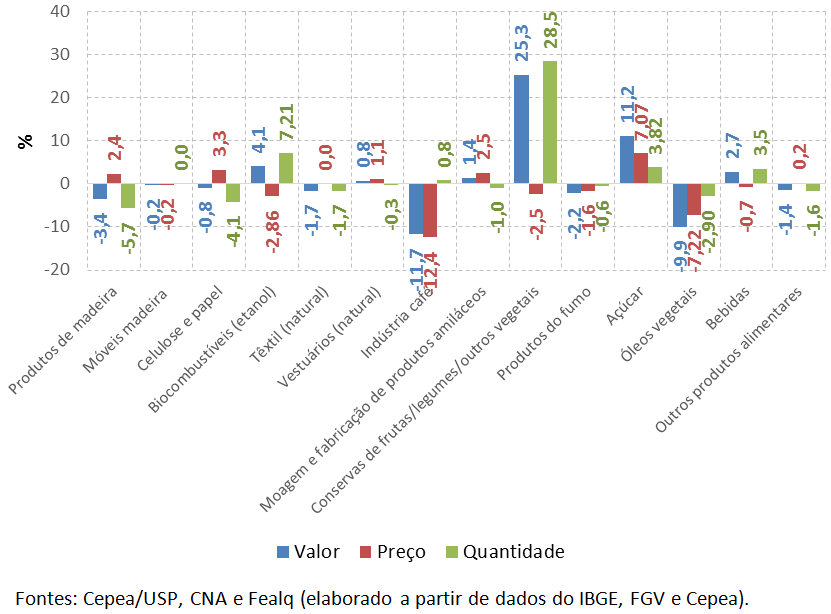 No acompanhamento da evolução do PIB realizado pelo Cepea, as indústrias de base agrícola que apresentaram projeção de crescimento do faturamento foram as de conservas de frutas/legumes/outros vegetais, açúcar, biocombustíveis, bebidas, moagem e, de forma mais modesta, vestuários. As demais indústrias apresentaram, em menor ou maior grau, perspectivas de redução (Figura 4).