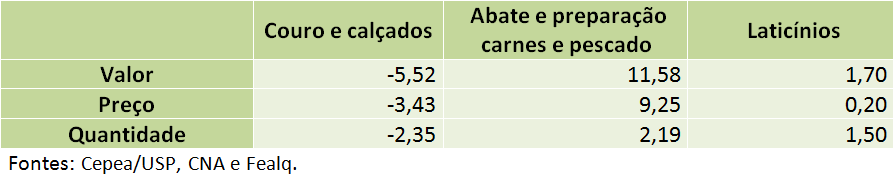 Tabela 5. Agroindústrias de base pecuária: variação anual do volume, preços reais e faturamento das indústrias pecuárias acompanhadas
