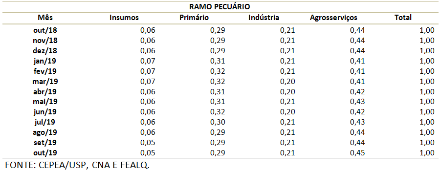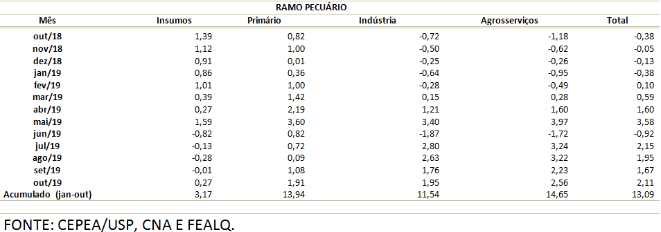 O PIB do segmento primário do agronegócio cresceu 0,71% em outubro, resultado que interrompe retrações no setor verificadas desde março. Tal expansão mensal reflete principalmente a alta de 1,91% do PIB da pecuária, aliada ao avanço de 0,14% da agricultura. No acumulado de janeiro a outubro de 2019, o PIB do segmento primário do agronegócio caiu 4,96%, motivado, principalmente, pela expressiva queda no ramo agrícola (-13,79%), visto que no ramo pecuário o segmento apresenta significativa alta (13,94%) (Tabelas de 1 a 3).
