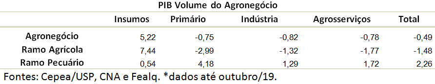 O PIB do agronegócio brasileiro cresceu 1,15% no acumulado de janeiro a outubro de 2019. O resultado decorre de comportamentos opostos entre os ramos, com queda de 3,24% no agrícola e alta expressiva de 13,09% no pecuário.