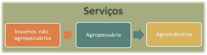 O Relatório PIB do Agronegócio Brasileiro é uma publicação mensal resultante da parceria entre o Centro de Estudos Avançados em Economia Aplicada (CEPEA), da Esalq/USP, a Confederação da Agricultura e Pecuária do Brasil (CNA) e a Fundação de Estudos Agrários Luiz de Queiroz (FEALQ). O agronegócio é entendido como a soma de quatro segmentos: insumos para a agropecuária, produção agropecuária básica (ou primária), agroindústria (processamento) e agrosserviços – como na Figura que segue. A análise desse conjunto de segmentos é feita para o ramo agrícola (vegetal) e para o pecuário (animal). Ao serem somados, com as devidas ponderações, obtém-se a análise do agronegócio.
