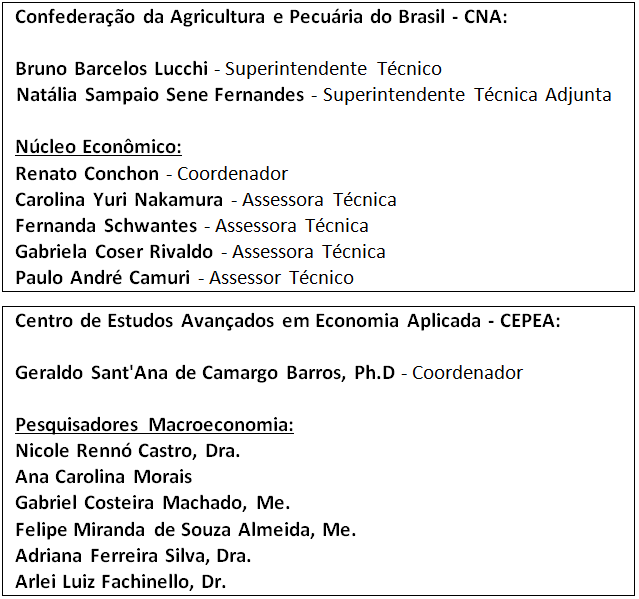 Importante também destacar que cada relatório considera os dados disponíveis – preços observados e estimativas anuais de produção – até o seu fechamento. Em edições futuras, ao serem agregadas informações mais atualizadas, há a possibilidade, portanto, de ocorrer alteração dos resultados, tanto no que se refere ao mês corrente, como também ao que se refere a meses e anos passados. Recomenda-se, portanto, sempre o uso do relatório mais atualizado. Para uma análise mais detalhada dos aspectos metodológicos, bem como dos resultados dos demais indicadores (PIB volume, Consumo Intermediário, etc.) ver http://www.cepea.esalq.usp.br/br/pib-do-agronegocio-brasileiro.aspx