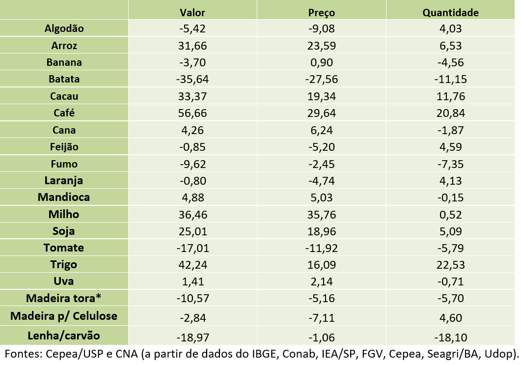 As Figuras 2 e 3 e a Tabela 4 detalham os resultados específicos do segmento por atividades agrícolas e pecuárias. Entre as culturas do segmento primário agrícola acompanhadas, espera-se crescimento de faturamento em 2020 para: arroz, cacau, café, cana-de-açúcar, mandioca, milho, soja, trigo e uva. Já as culturas para as quais se esperam quedas no faturamento são: algodão, banana, batata, feijão, fumo, laranja, tomate, madeira em tora, madeira para celulose e lenha e carvão.