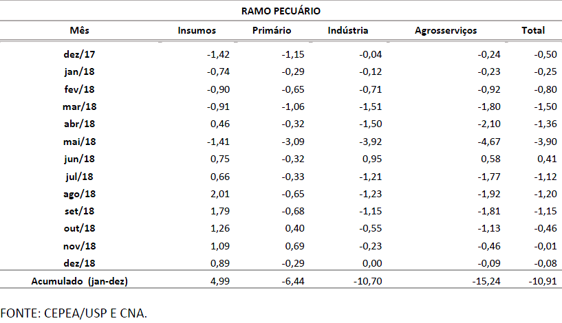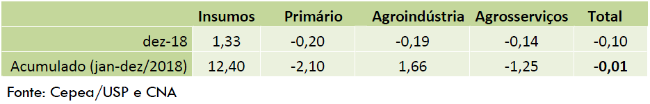 O Produto Interno Bruto (PIB) do agronegócio brasileiro, calculado pelo Centro de Estudos Avançados em Economia Aplicada (Cepea), da Esalq/USP, em parceria com a Confederação da Agricultura e Pecuária do Brasil (CNA), fechou 2018 com resultado praticamente estável na comparação com o ano anterior, com leve recuo de 0,01%. Para dezembro, especificamente, houve queda de 0,10%.