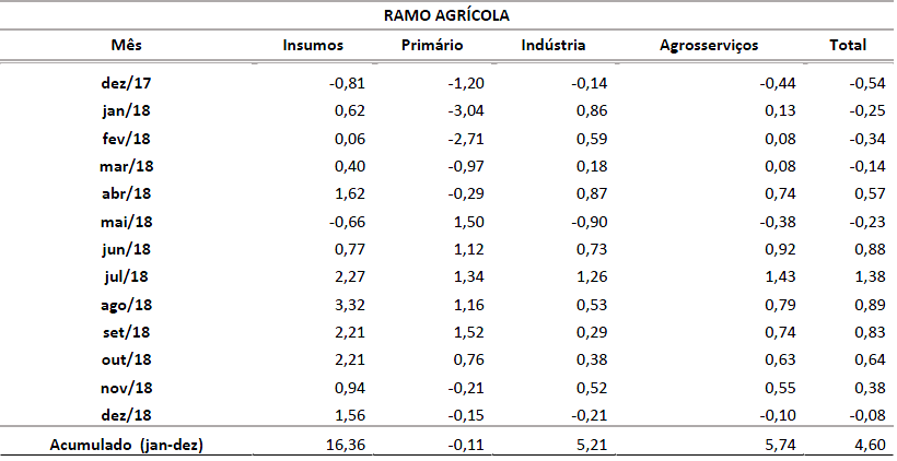 O segmento de insumos do agronegócio apresentou alta de 1,33% em dezembro, acumulando expressivo crescimento de 12,40% em 2018. Verificou-se desempenhos positivos tanto para os insumos agrícolas (de 1,56% em dezembro e de 16,36% no ano) como no ramo pecuário (de 0,89% no mês e de 4,99% em 2018) (Tabelas 1 a 3).