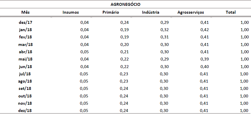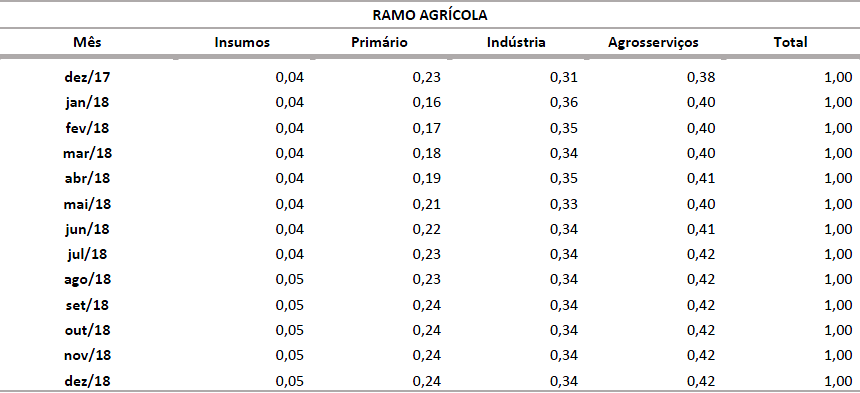 Em dezembro, os desempenhos dos segmentos nos ramos agrícola e pecuário foram, respectivamente, de: insumos: 1,56% e 0,89%; primário: -0,15% e -0,29%, agroindústria: -0,21% e 0,0%; e agrosserviços: -0,10% e -0,09%. No acumulado do ano: insumos: 16,36% e 4,99%; primário: -0,11% e -6,44%; agroindústria: 5,21% e 10,70%; e agrosserviços: 5,74% e -15,24% (Tabelas 2 e 3).