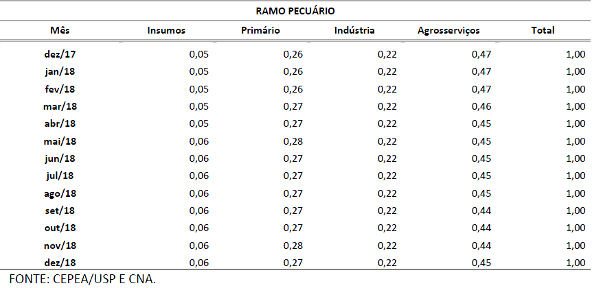 Com relação aos segmentos, no ramo agrícola, apenas o primário não apresentou resultado positivo no ano. Já na variação mensal, somente o segmento de insumos registrou alta. Para o ramo pecuário (tabela 3), houve elevação em insumos e estabilidade na indústria em dezembro, com queda nos demais. Na variação anual, apenas o segmento de insumos fechou com crescimento no ramo (4,99%).