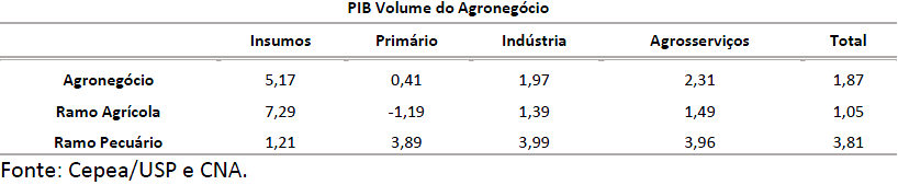 - Nota técnica: O PIB Volume do Agronegócio trata-se do PIB do agronegócio calculado pelo critério de preços constantes. Resulta, portanto, a variação apenas do volume de produção. Este é o indicador de PIB comparável às variações apresentadas pelo IBGE.