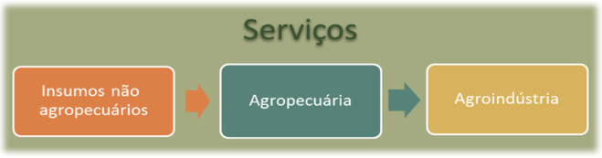 O Relatório PIB do Agronegócio Brasileiro é uma publicação mensal resultante da parceria entre o Centro de Estudos Avançados em Economia Aplicada (CEPEA), da Esalq/USP, e a Confederação da Agricultura e Pecuária do Brasil (CNA). O agronegócio é entendido como a soma de quatro segmentos: insumos para a agropecuária, produção agropecuária básica (ou primária), agroindústria (processamento) e agrosserviços – como na Figura que segue. A análise desse conjunto de segmentos é feita para o ramo agrícola (vegetal) e para o pecuário (animal). Ao serem somados, com as devidas ponderações, obtém-se a análise do agronegócio.