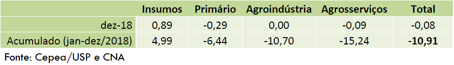 Entre os ramos, o agrícola apresentou resultado anual positivo, com crescimento de 4,60%. Já o pecuário sentiu os efeitos da baixa demanda interna e da restrição de importantes mercados internacionais ao longo 2018, fechando com queda de 10,91%. Em dezembro, especificamente, ambos registraram leve baixa de 0,08% (Tabelas 2 e 3).