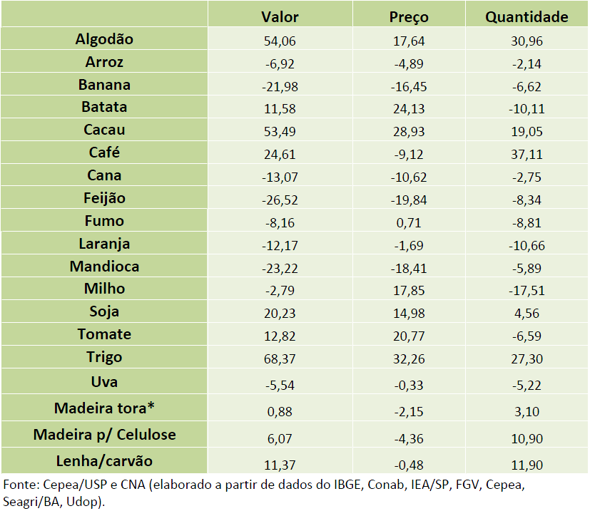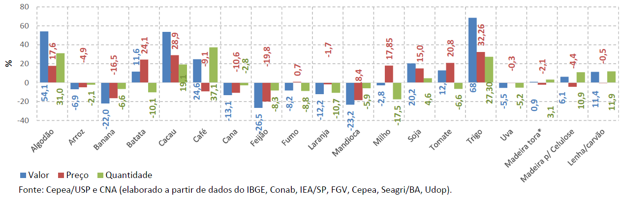 A cultura do algodão também foi destaque em 2018, com evolução significativa do faturamento decorrente tanto da elevação de preços (17,64%) como de produção (30,96%) no ano. De acordo com a equipe Algodão/Cepea, os preços foram sustentados em alto patamar ao longo de todo o ano, devido, principalmente, ao elevado volume exportado, que reduziu o nível de estoques internos, face ao impulso advindo da alta dos preços externos do produto. Na produção, de acordo com a Conab, a rentabilidade da cultura no momento do cultivo impulsionou o aumento de área, o que, aliado ao crescimento em produtividade, decorrente do uso de um melhor pacote tecnológico e das condições climáticas favoráveis, levou a produção brasileira a atingir volume recorde.