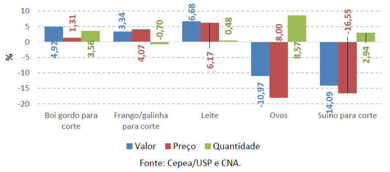 Para o segmento primário da pecuária, houve alta nos faturamentos para bovinocultura de corte, leite e frango e baixa para as demais atividades (Figura 3).