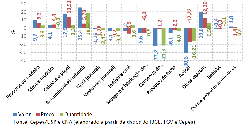 No acompanhamento feito pelo Cepea para a evolução do PIB, as indústrias de base agrícola que apresentaram perspectivas de crescimento do faturamento foram: óleos vegetais, biocombustíveis, celulose e papel, produtos de madeira, móveis de madeira e outros produtos alimentares. Por outro lado, as indústrias que registram perspectivas de redução foram açúcar, moagem e fabricação de produtos amiláceos, bebidas, fumo, indústria do café, conservas de frutas/legumes/outros vegetais, vestuários e têxtil (Figura 4).