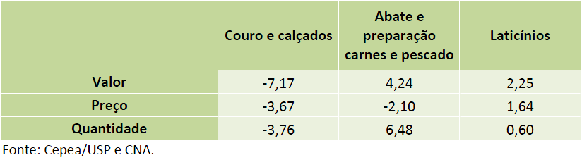 Com relação às indústrias pecuárias, os resultados são apresentados na Tabela 5. Verifica-se baixa no faturamento apenas para couro e calçados, enquanto que, para laticínios e a indústria de abate, houve alta no ano.
