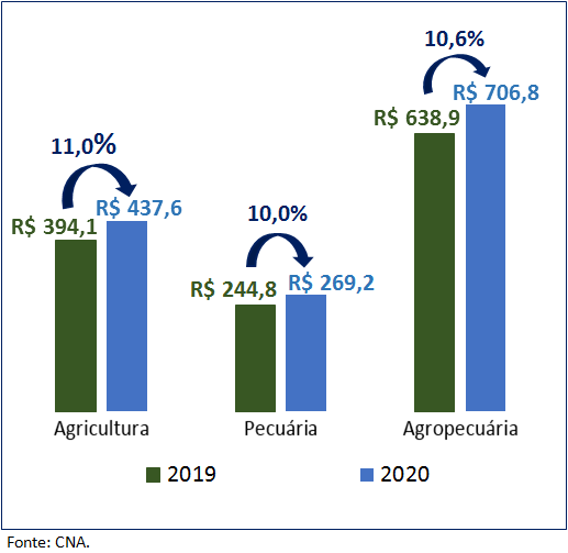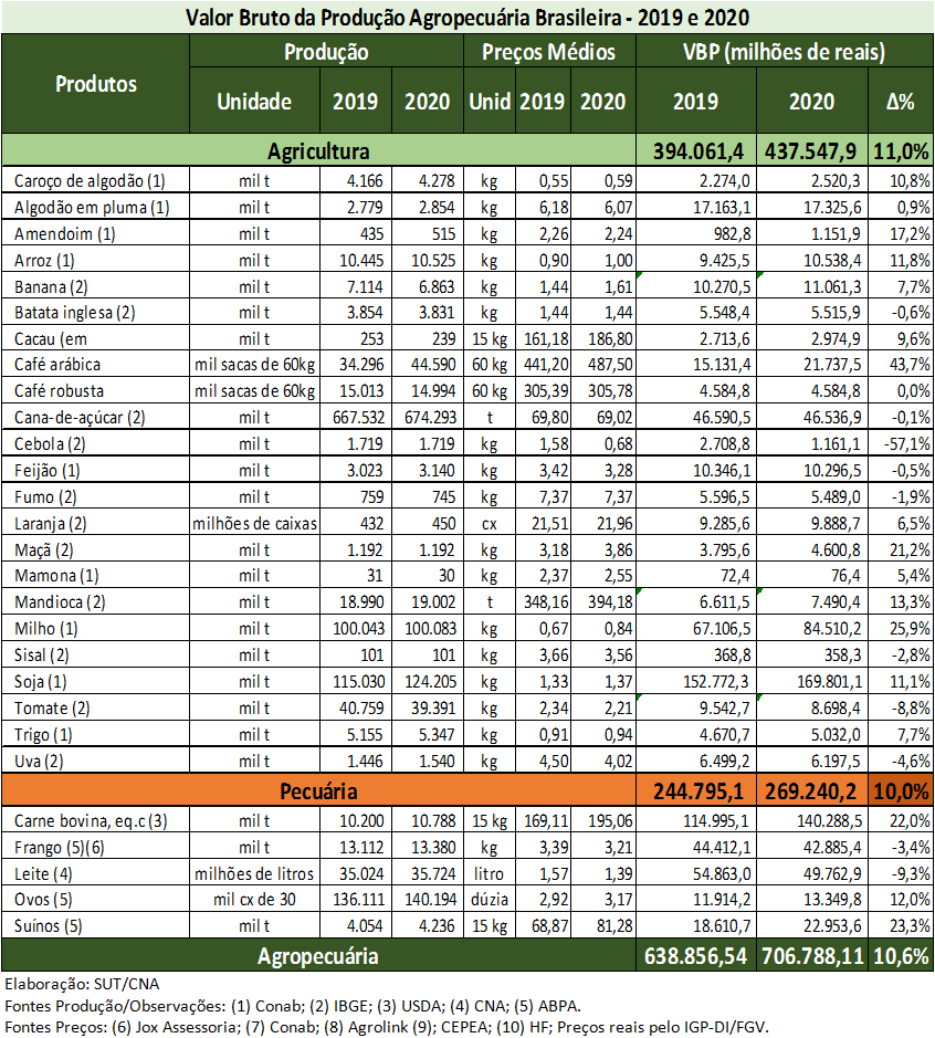 O Valor Bruto da Produção (VBP) agropecuária deve atingir os R$706,8 bilhões em 2020, um crescimento de 10,6% comparativamente ao ano anterior.