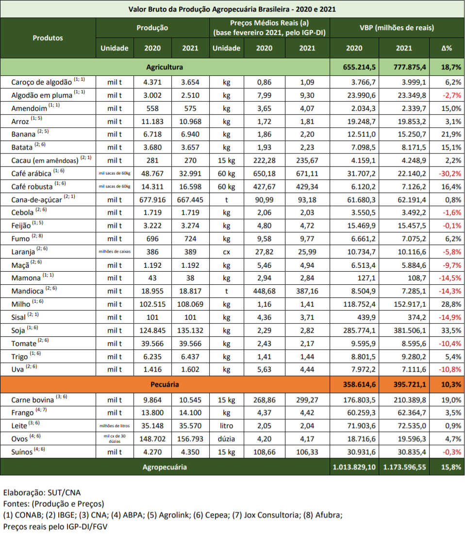 O VBP agrícola em 2021 deve crescer 18,7%, atingindo R$ 777,87 bilhões. O bom resultado estimado para o ano é causado pela boa expectativa da safra de grãos, que deve representar 52,9% na participação do VBP. Destaques para os aumentos dos preços reais, no ano, da soja, milho, caroço de algodão e trigo (33,5%, 28,8%, 6,2% e 5,4% respectivamente).