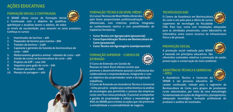 Com a ampliação da educação profissional e tecnológica e disseminação de conhecimento e inovação, por meio de cursos Técnicos de nível médio e Superior de Tecnologia, presenciais e a distância, e de cursos de Formação Inicial e Continuada (FIC), o Centro contribuirá com o desenvolvimento da cadeia produtiva de bovinocultura de corte, que hoje tem processos produtivos com elevado nível de sofisticação e requer profissionais cada vez mais capacitados.