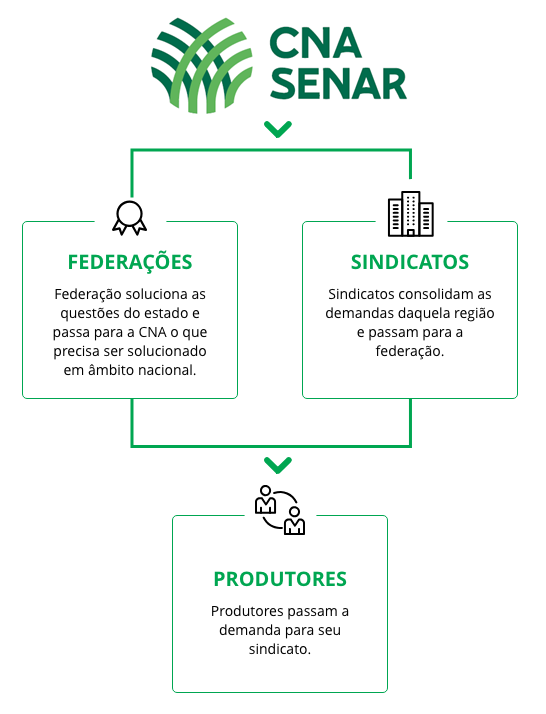 O Sistema funciona da seguinte forma: as Federações da Agricultura e Pecuária atendem os Estados e representam os Sindicatos Rurais, que por sua vez, desenvolvem ações diretas de apoio ao produtor rural, buscando soluções para os problemas locais. E a CNA defende os interesses dos produtores junto ao Governo Federal, ao Congresso Nacional e aos tribunais superiores do poder Judiciário, nos quais dificilmente um produtor, sozinho, conseguiria obter respostas para as suas demandas. Acesse o Estatuto.