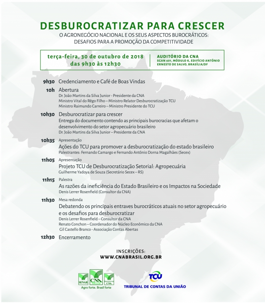 A programação prevê as palestras “Ações do TCU para promover a desburocratização do estado brasileiro”, “Projeto TCU de Desburocratização Setorial: Agropecuária” e “As razões da ineficiência do Estado Brasileiro e os Impactos na Sociedade”, além da mesa redonda “Debatendo os principais entraves burocráticos atuais no setor agropecuário e os desafios para desburocratizar”.