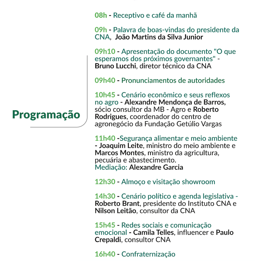 Está prevista uma extensa programação que inclui debates, análises de cenários econômicos, políticos e da agenda legislativa do setor, além de palestras sobre segurança alimentar, meio ambiente e comunicação. Confira!