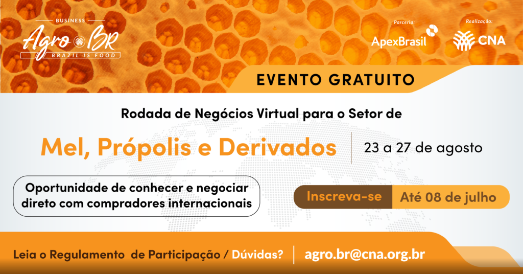 Você, empreendedor rural inscrito no Agro.BR do setor de mel, própolis, derivados e outras preparações, inscreva-se e participe de encontros individualizados com compradores internacionais em rodadas de negócios virtuais.
