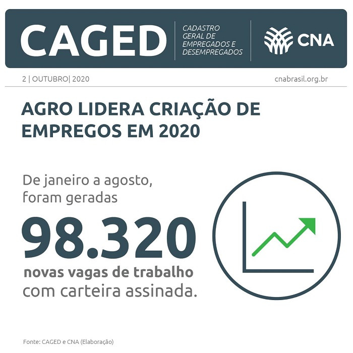 Brasília (02/10/2020) – A agropecuária lidera a geração de novas vagas de emprego em 2020, com 98.320 postos de janeiro a agosto. Os setores do agro e da construção civil são os únicos com saldo positivo no acumulado do ano, segundo Comunicado Técnico da Confederação da Agricultura e Pecuária do Brasil (CNA), que analisou os dados do novo Cadastro Geral de Empregados e Desempregados (Caged) do Ministério da Economia.