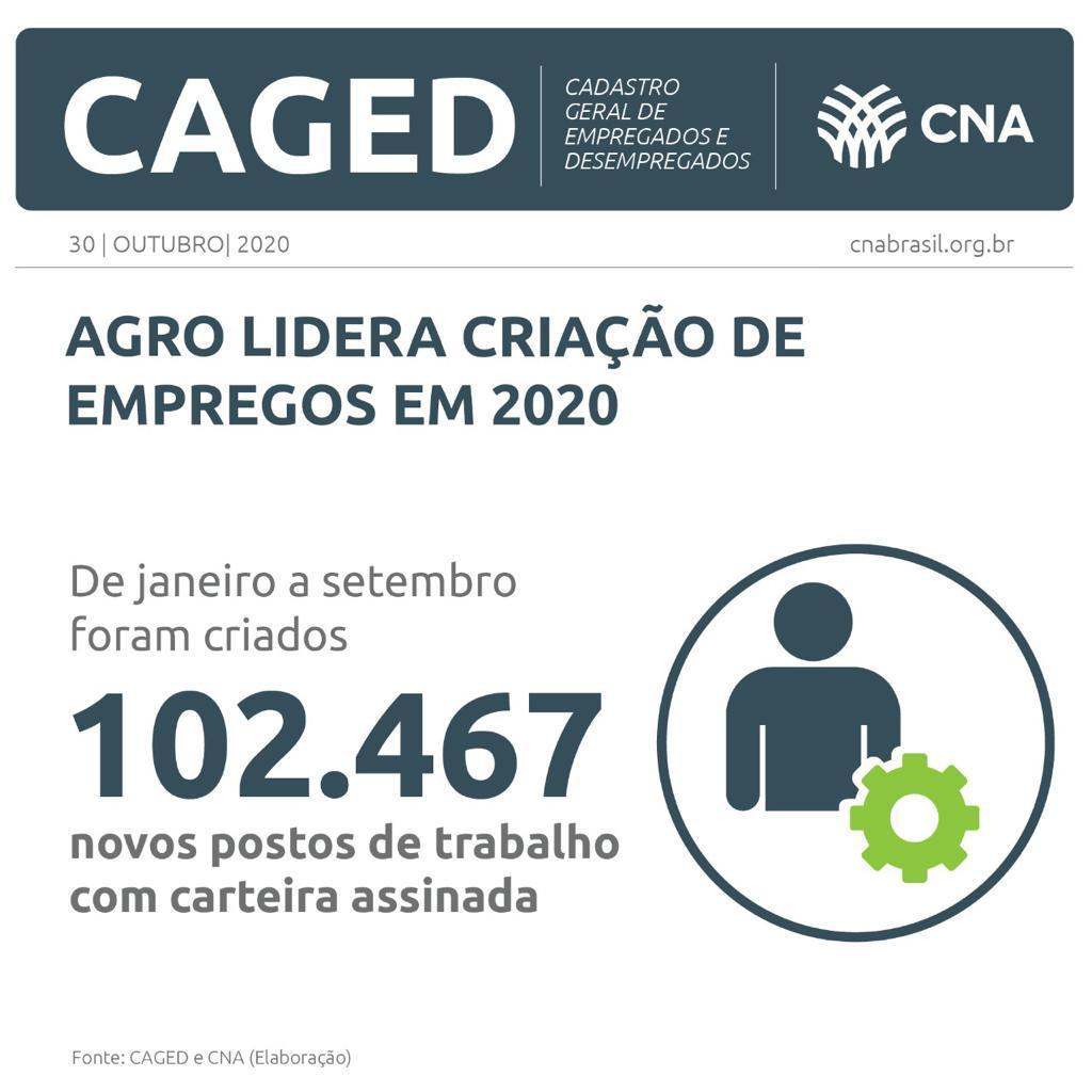 Brasília (30/10/2020) - A agropecuária segue como o setor da economia que mais gerou empregos em 2020, com 102.467 vagas de janeiro a setembro deste ano, segundo Comunicado Técnico da Confederação da Agricultura e Pecuária do Brasil (CNA).