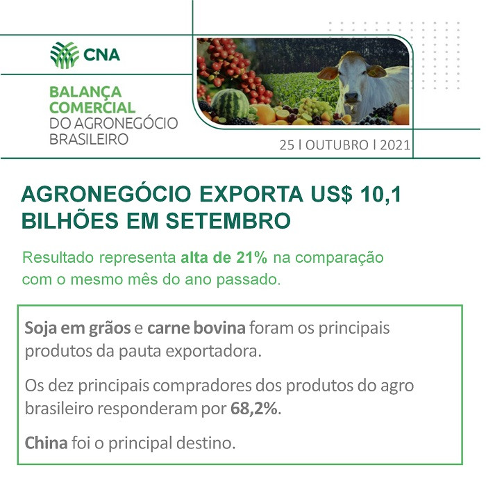 Brasília (25/10/2021) – O agro brasileiro gerou em setembro deste ano uma receita de US$ 10,1 bilhões, alta de 21% em relação ao mesmo mês de 2020, segundo análise da Confederação da Agricultura e Pecuária do Brasil (CNA) com base nos dados do Ministério da Economia.
