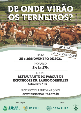 O rebanho bovino do Rio Grande do Sul tem uma taxa de desmame de, em média, 55% ou 56% - índice bem abaixo do ideal. Para colaborar com a eficácia produtiva e o gerenciamento da atividade pecuária, o Serviço Nacional de Aprendizagem Rural (Senar-RS) realiza, nos dias 25 e 26 de novembro, a 106º etapa do Fórum Permanente do Agronegócio De Onde Virão os Terneiros? Desta vez, o evento itinerante será realizado em Alegrete.