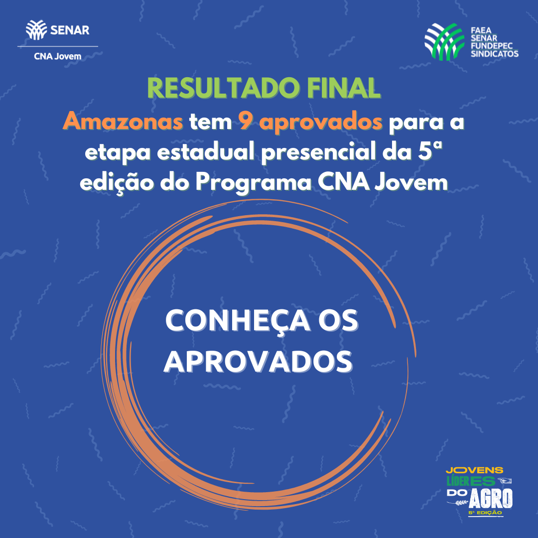 O Amazonas teve 9 jovens aprovados para a 2ª etapa (Estadual Presencial) do programa CNA Jovem (5ª edição). O programa, que tem objetivo de formar e desenvolver lideranças no agro brasileiro, tem duração aproximada de 12 meses e é dividido em 3 etapas: nacional remota, estadual presencial e nacional presencial.