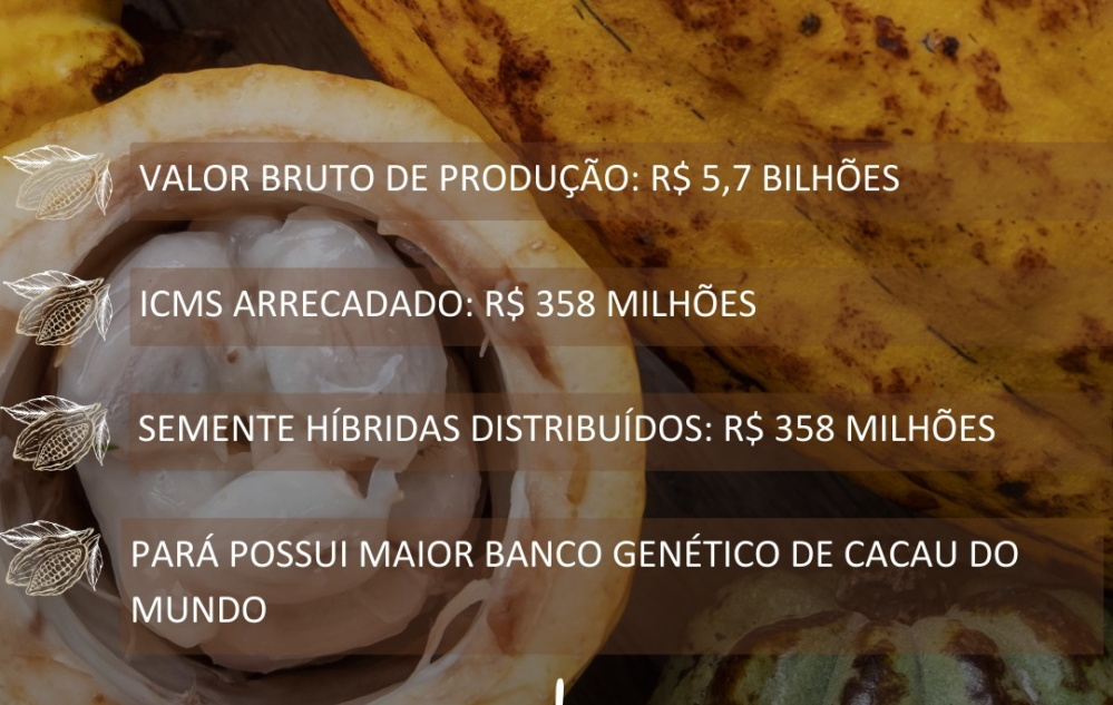 O número de produtores de cacau no Pará é de 32.700 produtores, em uma área total plantada de 169.650 ha. A produção de cacau no estado, segundo o IBGE, é de 143.675 toneladas de amêndoa (Sedap/Ceplac). O valor bruto de produção de cacau é de R$ 5,7 bilhões e o ICMS arrecadado no Pará é de aproximadamente R$ 358 milhões. Houve uma valorização entre janeiro de 2024 comparado com dezembro de 2024 na ordem de 172,6%, saindo de uma média de valor de R$ 22,79/Kg para R$ 63,13/Kg, representando um aumento no valor de venda da amêndoa de cacau, considerando os dados do Estado do Pará.