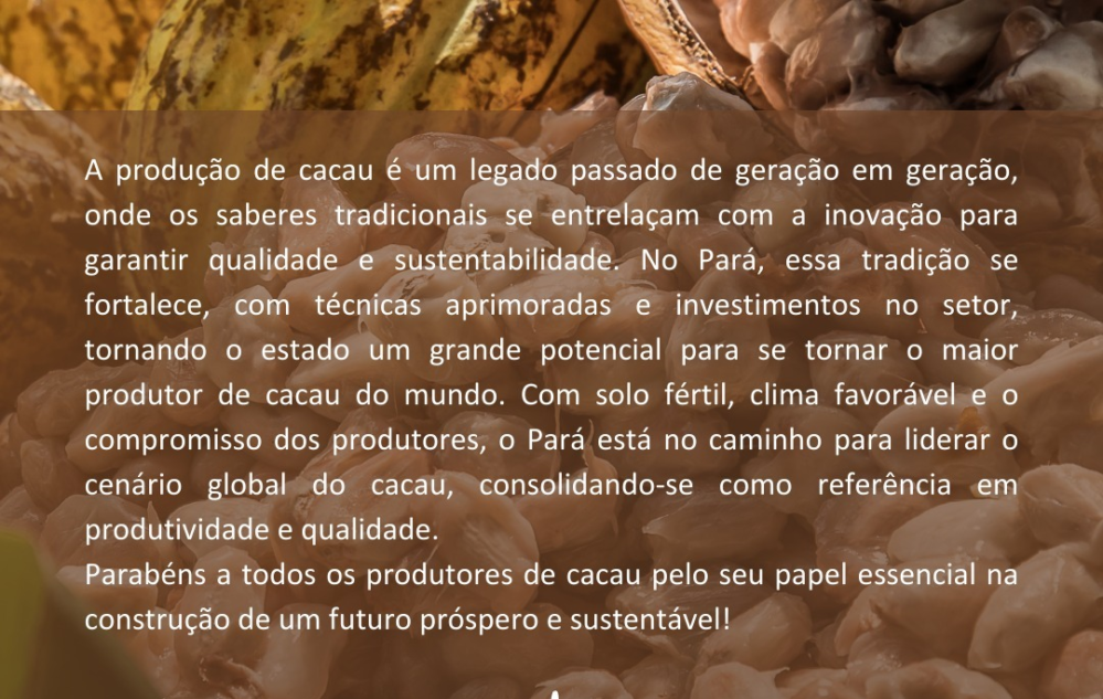 O cacau é muito mais do que um fruto, traz com ele uma história rica que perpassa séculos de cultura, agricultura, gastronomia e tecnologia, transformando vidas e a economia no estado do Pará e no Brasil. Confira abaixo alguns números que mostram a importância da cultura cacaueira em nosso estado.