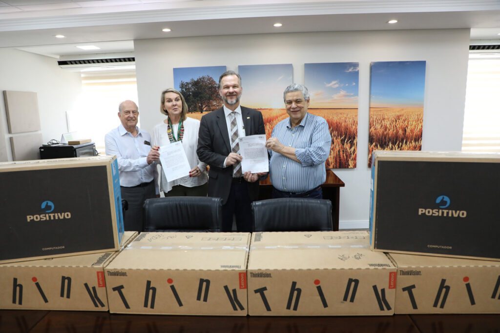 O presidente do Sistema FAEP/SENAR-PR, Ágide Meneguette, entregou, nesta quarta-feira (27), três computadores ao reitor da Universidade Tecnológica Federal do Paraná (UTFPR), Marcos Flávio de Oliveira Schiefler Filho. A entrega faz parte de um termo de cooperação que tem por objetivo o desenvolvimento de um aplicativo para auxiliar produtores rurais no monitoramento de pragas nas lavouras de soja, milho e trigo. O Instituto de Desenvolvimento Rural do Paraná (IDR-Paraná) também faz parte do projeto. Até o fim do convênio, o SENAR-PR deve aportar mais de R$ 292 mil na iniciativa.