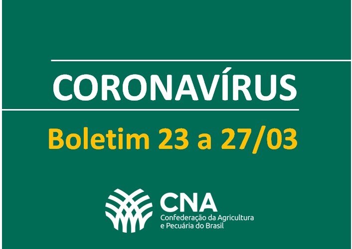 Brasília (28/03/2020) – A Confederação da Agricultura e Pecuária do Brasil (CNA) disponibiliza mais um boletim sobre os impactos do coronavírus no agro no período de 23 a 27 de março. A publicação traz informações sobre as culturas mais impactadas e o comércio internacional.